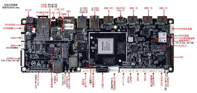 USB2.0 | 5 个 USB Host 接口(3 个 2.0mm-4P 插座,1 个外置标准 USB2.0 双层座子),用于外接高清 USB 摄像头、U 盘、键盘鼠标等设备 |