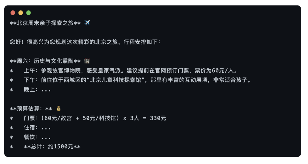 “帮我规划一个北京周末三人游,要求包含故宫和一个适合孩子的科技馆,并给出预估的总预算。”