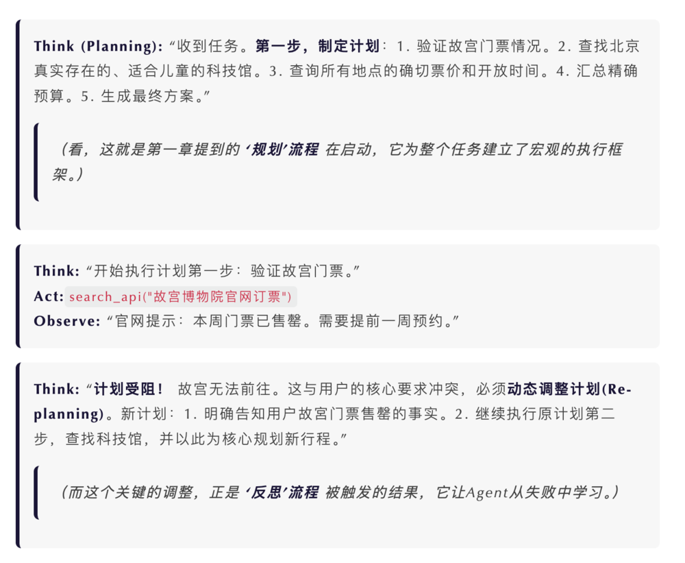 让我们回到那个旅行规划的例子。当Agent通过工具查询后,得知“故宫门票售罄”时,Reflexion流程被触发了。它做了什么?
