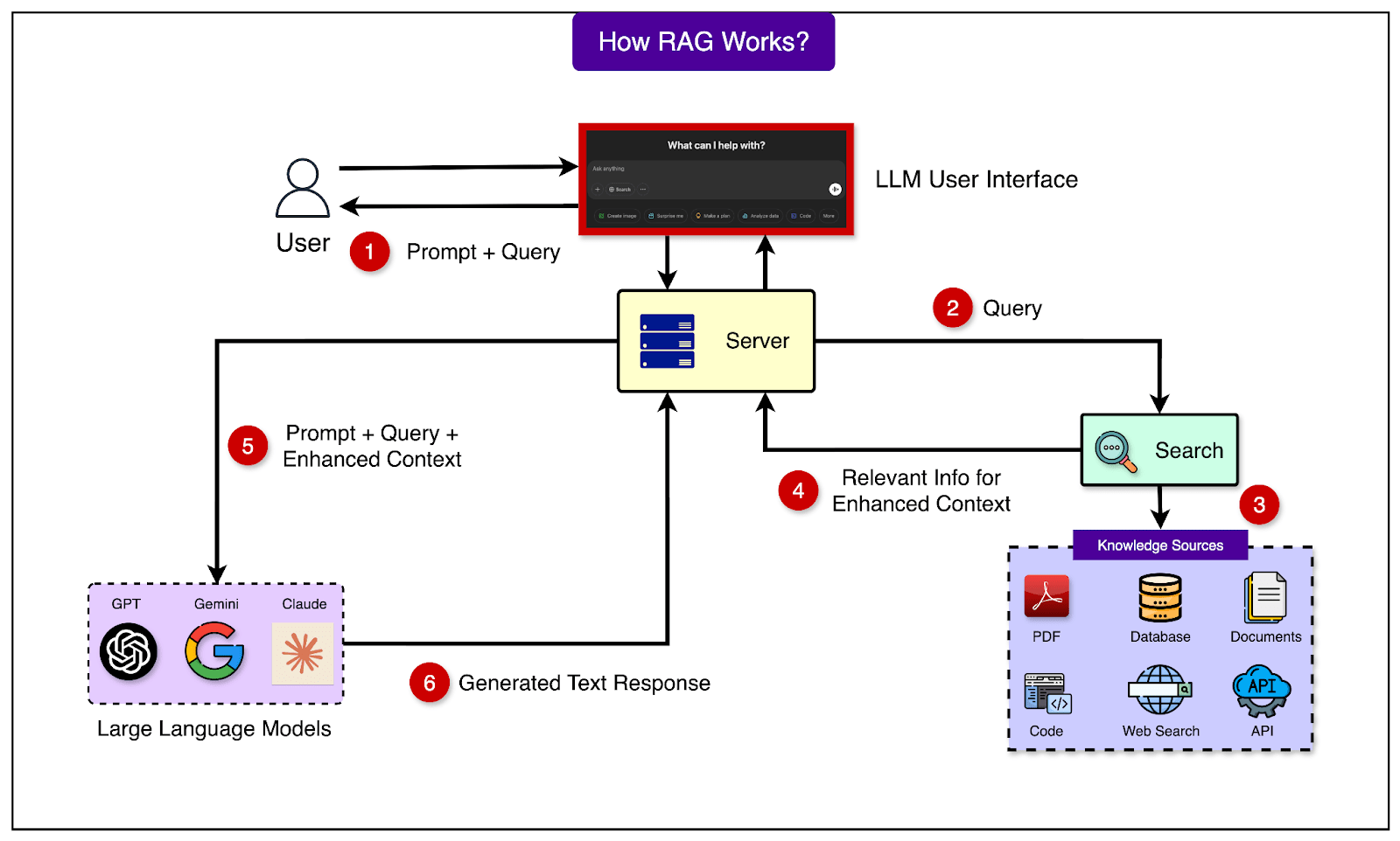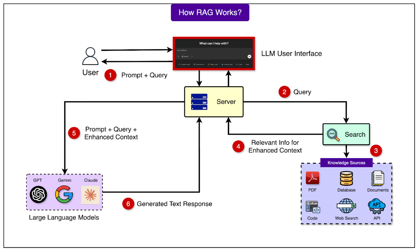 When we ask a question, the RAG system first searches through vast external databases to find relevant documents or passages.