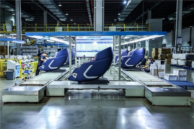 智造为基 打造发展主引擎如果说技术创新、生态构建是荣泰引领行业发展的“引擎”,那么强大的智能制造能力则是确保这台引擎持续、稳定输出动力的坚实“底盘”。位于浙江南浔的荣泰智慧工厂,是行业内自动化、智能化水平最高的按摩椅生产基地之一。在这里,智能制造与数字化管理贯穿于生产的每一个环节,为荣泰卓越的产品品质和高效的市场响应能力提供了最可靠的保障。走进荣泰南浔智慧工厂,智能制造与数字化管理贯穿生产全流程,自动化流水线、ABB机械手、EMS流水线控制系统、WMS仓库管理系统、MES生产管理系统协同运作,实现物料自动分拣、产品自动检测、成品自动入库,日均最高产能可达500台,并通过精益生产模式,灵活兼容批量与小批量生产任务,每月节约换线时间超过10小时,以更柔性、更灵活的生产模式实现降本增效。