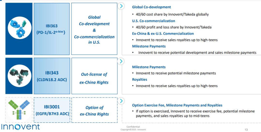 不同于传统BD交易,信达生物与武田制药的合作,涉及3个分子(IBI363、IBI343、IBI3001),且每一个分子的交易条款均各不相同。
