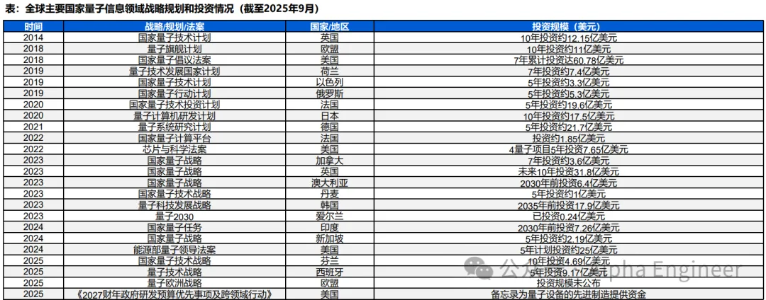 其中,美国于2025年9月23日白宫发布的2027财年政府研发优先事项备忘录中,明确将 人工智能 与 量子计算 列为2027年研发预算优先级首位,并指出量子计算正从实验室走向产业化应用的关键拐点已至, 2027年是重要拐点 。