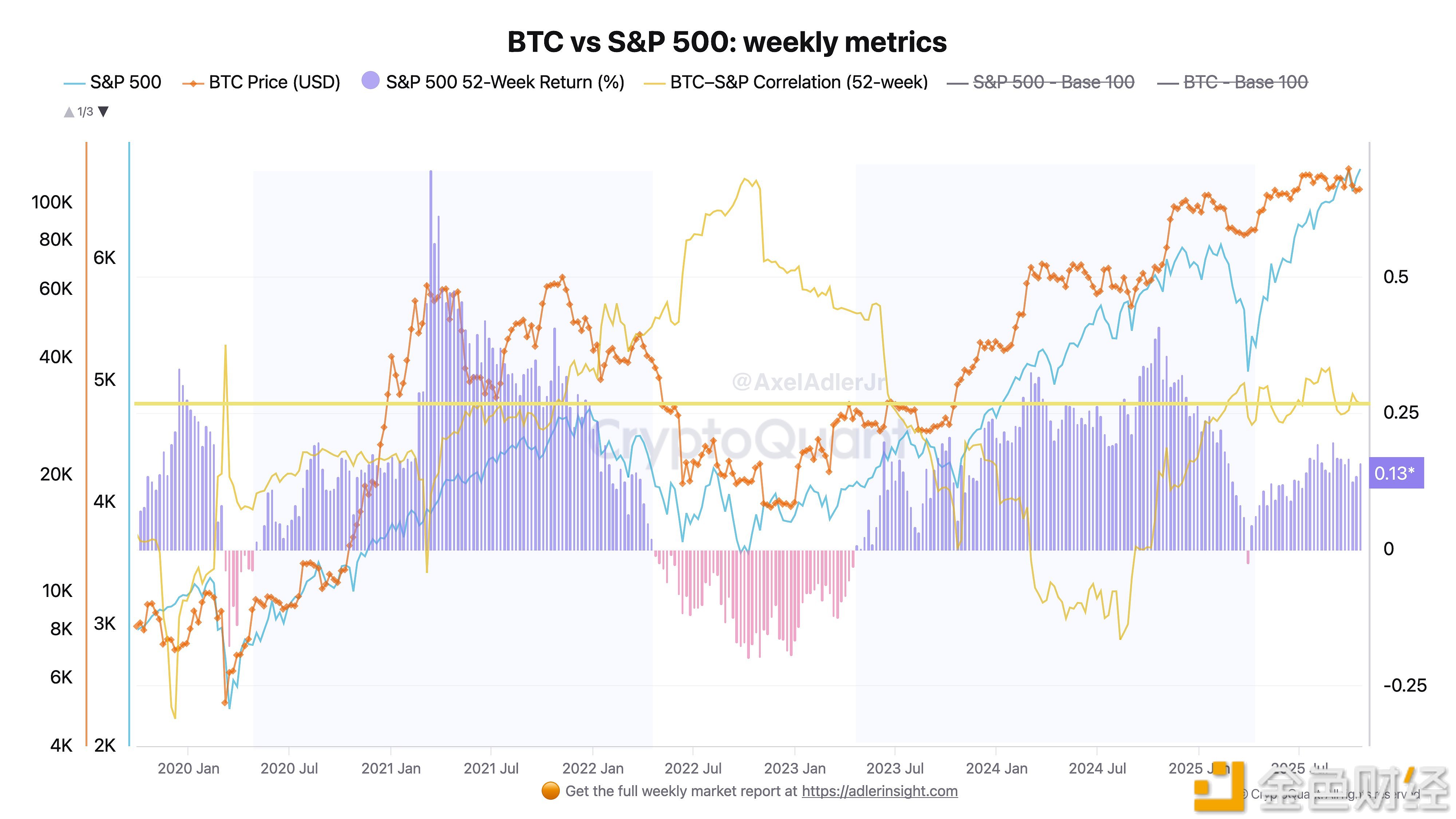 【分析师:比特币与标普 500 指数依然处于牛市后期阶段】金色财经报道,Cryptoquant分析师Axel Adler Jr发布市场分析表示,比特币与标普500指数目前均维持在牛市后期阶段。其中,标普500指数过去52周回报率达13%,表明市场仍处于风险偏好(risk-on)模式—— 这一阶段投资者对经济前景持乐观态度,更倾向于配置股票、加密货币等风险资产以追求更高收益。 从资产联动性来看,比特币与标普500指数的相关性为0.26,呈现温和正相关关系:这意味着比特币走势与股市整体趋于同向,但并非完全依赖股市波动。值得注意的是,标普500指数对宏观经济变化及政治言论仍高度敏感,若传统金融市场情绪降温,可能迅速传导至比特币市场。 2025年第四季度,市场焦点将转向企业盈利表现。在经历两年的收益率增长后,投资者正更关注实际盈利数据的验证。当前2025年第三季度财报季正全面展开,已披露业绩的 58 家公司全部超出预期,平均超预期幅度达571个基点,市场对整体盈利增长的预期也从7%上调至8%—— 这正是牛市周期末期的典型特征。从更广泛市场数据看,标普500成分股中已有85%的企业盈利超预期,创下 2021 年以来的最高比例,强劲的业绩表现为牛市后期行情提供了关键支撑。