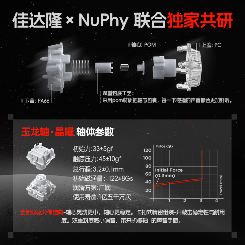✨ **创新磁轴技术与复古手感并存**:NuPhy WH80键盘搭载了与佳达隆联合研发的玉龙轴・晶耀,其核心亮点在于采用了双驱分体结构磁轴设计。通过在轴芯外部使用POM材质进行封底,成功地模拟了传统机械轴体的敲击音效和触感,为用户带来熟悉且令人愉悦的打字体验,同时结合了磁轴的精准与快速响应特性。