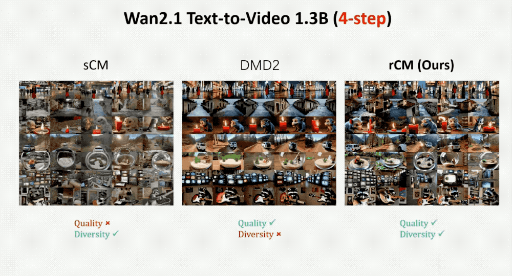 通过引入前向-反向散度联合优化框架,rCM在大幅提升推理速度(高达50倍)的同时,兼顾了生成结果的高质量与高多样性。