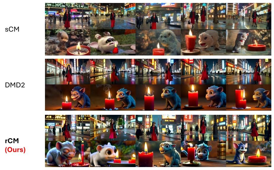 rCM不仅提供了一个无需多阶段训练与复杂超参搜索的高效蒸馏方案,还揭示了结合前向与反向散度是提升生成模型性能的统一范式。