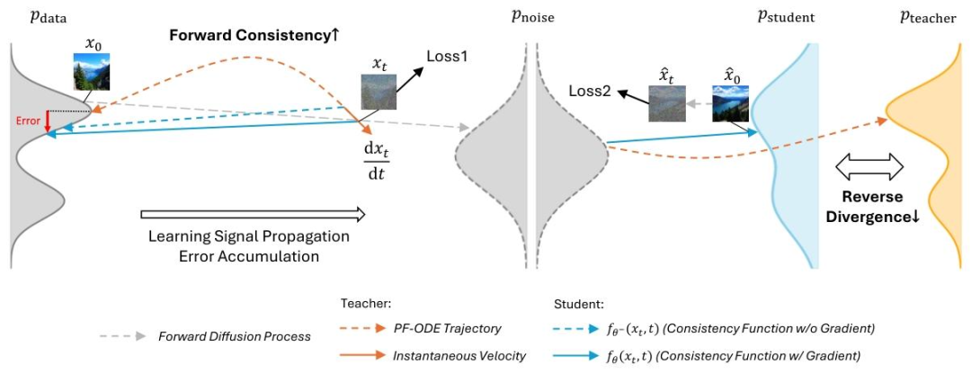 rCM 在sCM的基础上,引入了基于分数蒸馏的反向散度(Reverse Divergence)作为正则项,构建了一个前向-反向联合蒸馏框架。
