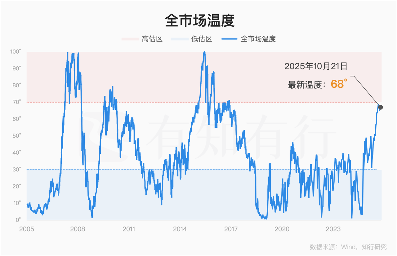 这意味着,我们的全市场温度也好、指数温度也好,低估和高估的实现难度会更大一些。但一旦出现,也意味着其顶部和底部在过去很长周期里的代表性也更强。我们看上面全指信息指数的行情走势和温度走势,可以得到很好的验证。