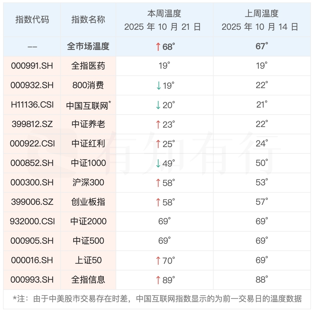 先来看看最近一周的股市表现,从上周三到本周二,A股、港股小幅上涨。中证全指上涨 0.83%,恒生指数上涨2.3%。我们最新的全市场温度小幅提升到 68°。