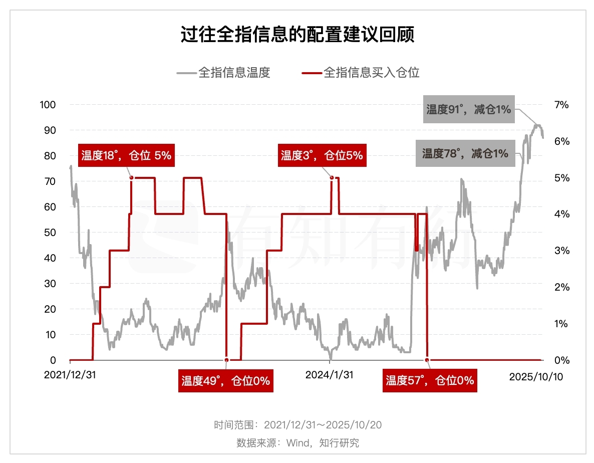 今年全指信息大幅上涨后,指数温度来到了高估区间,长钱账户开启了减仓全指信息的操作。第一次减仓发生在 2025 年 8 月 20 日,当时全指信息温度是 78°。长钱账户通知持有全指信息基金的用户,卖出了 1% 左右的全指信息,换仓到800消费上。第二次减仓发生在 10 月 10 日,长钱账户再次卖出了 1% 左右的全指信息,并换仓到恒生科技上。10 月 10 日全指信息温度已经高达 91°。
