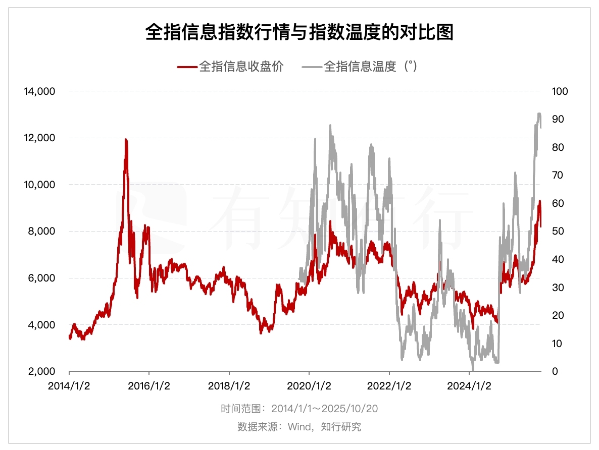 对有知有行来说,在计算指数温度时,把 2015 年的牛市顶点包含了进来。下图展示了全指信息 2014 年至今的指数行情和指数温度数据。从指数行情走势来看,全指信息从 2014 年到现在经历了多轮牛熊周期。简单来说,2015 年 6 月以及 2020 年 7 月,分别对应着全指信息牛市的顶部位置。全指信息的底部位置出现过多次, 2018 年年底、2022 年到 2024 年出现了多次探底。