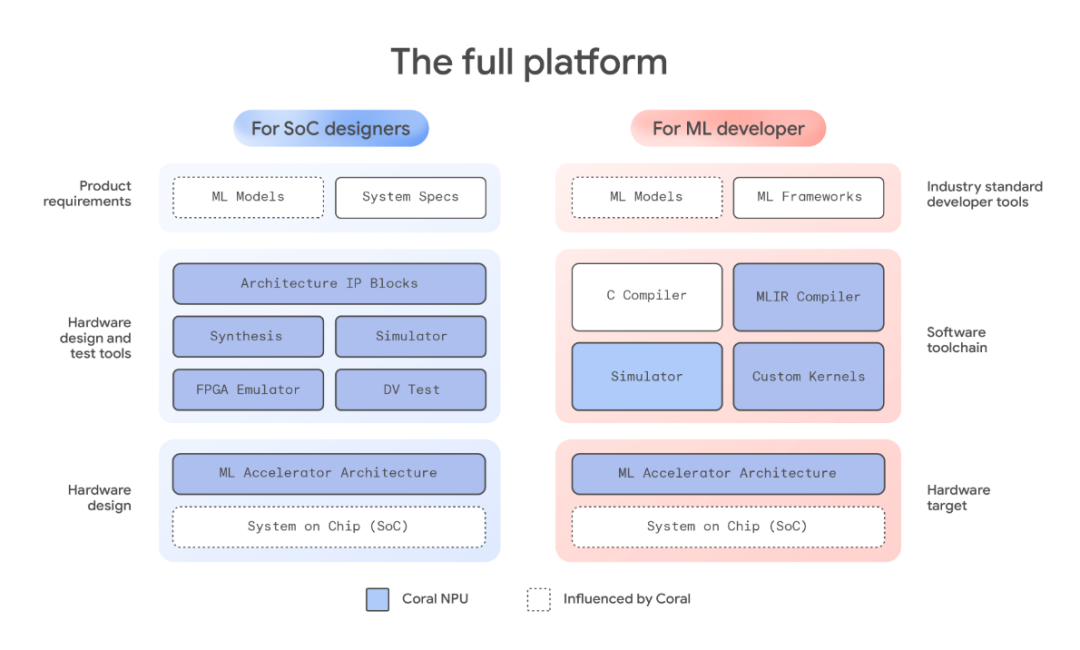 🔗 为了解决工具链碎片化的问题,Coral NPU配备了一个统一的编译器堆栈,基于MLIR、IREE和TensorFlow Lite Micro等开源技术。开发者只需编写一次模型代码,就能在任何基于Coral NPU架构的芯片上运行,真正实现模型的跨硬件无缝迁移,极大地降低了开发门槛。