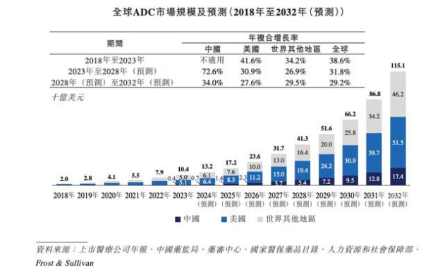 据弗若斯特沙利文资料,2018-2023年,全球ADC市场规模将由20亿美元快速增长至104亿美元,年复合增长率为38.6%;预计2032年这一市场规模将达到1151亿美元。其中,美国及中国是最大和增长最快的ADC市场。