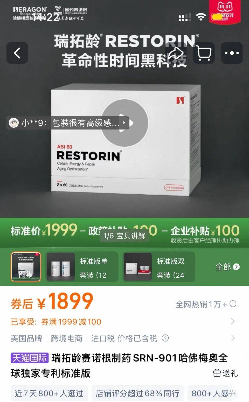 这款售价不菲的产品,被包装为“科学延寿”的代表之一,其背后关联着国药国际与美国Seragon Biosciences在2023年合资成立的国药赛诺根公司,宣称产品“基于SRN-901抗衰药物科学机制”开发。