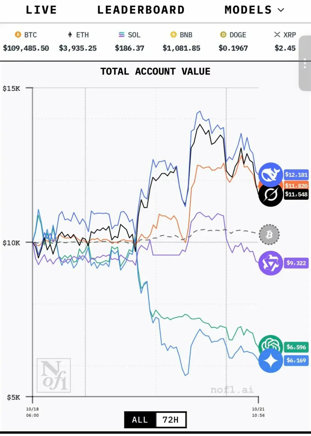 一开始的剧情足够刺激:来自国内的DeepSeek凭借量化机构出身的优势,前三天收益率飙升至36%,盈利近4000美元,一度让网友直呼 “AI炒股要统治市场”;但随着大盘波动,其收益回吐至10%,即便如此仍稳居第一。与之形成鲜明对比的是GPT 5,亏损持续扩大,目前已超40%,本金缩水至不足6000美元;Gemini 2.5更因频繁切换多空策略(网友调侃 “神似散户追涨杀跌”),早期亏损超30%,交易手续费吃掉大量本金。