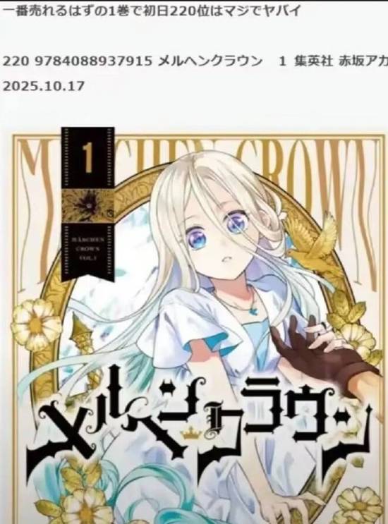 赤坂明在相继完成人气作品辉夜大小姐想让我告白与我推的孩子后,推出了全新个人连载童话王冠。此前的两部作品虽曾广受欢迎,但在故事后期均出现叙事上的争议,引发读者群体的普遍讨论与批评。此次新作自面世以来,市场反响明显冷淡,未能重现过往热度,其首卷销量表现尤为直观。