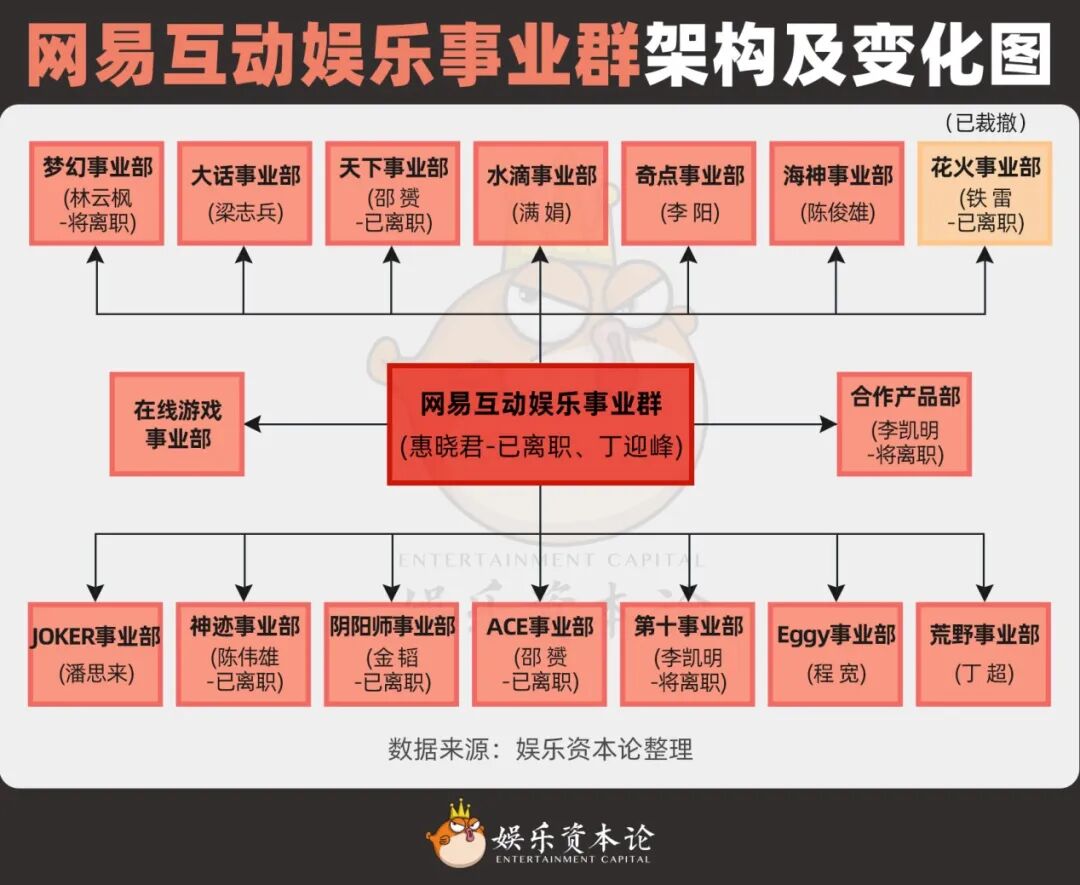 首先是2023年,网易互娱负责华东区域业务的联席总裁惠晓君被退休,接着网易游戏高级副总裁、天下事业部总裁邵赟于2024春节后离职,且天下事业部被一拆三分为Eggy事业部、荒野事业部与天下事业部。