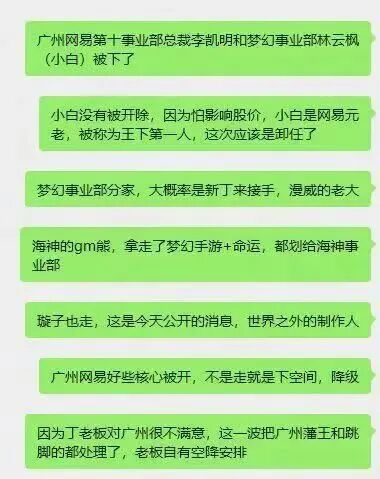 不久前,一张关于网易互娱事业群广州各大事业部高管发生人事“大地震”的微信截图在行业内以及社交平台上流传,其中梦幻事业部总裁林云枫与第十事业部总裁李凯明均传被“卸任”,其中梦幻事业部还要步去年的天下事业部的后尘,被拆分、重组。