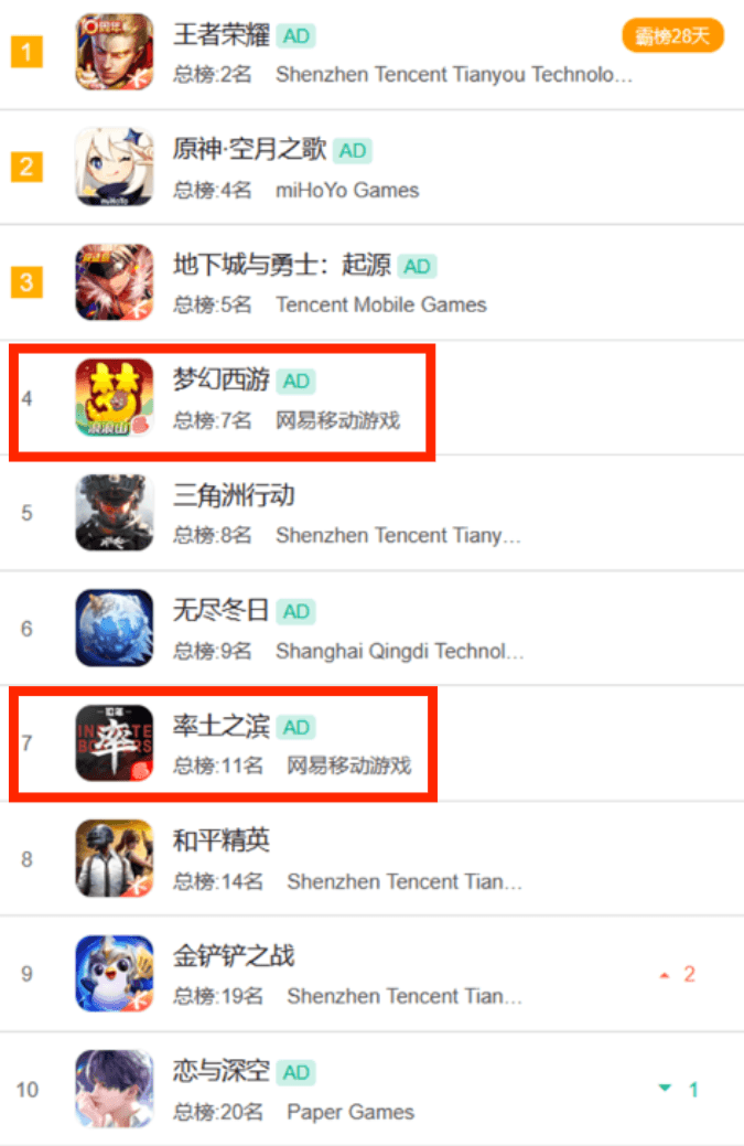 10月23日网易只有《梦幻西游手游》与《率土之滨》进入畅销榜Top10行列
