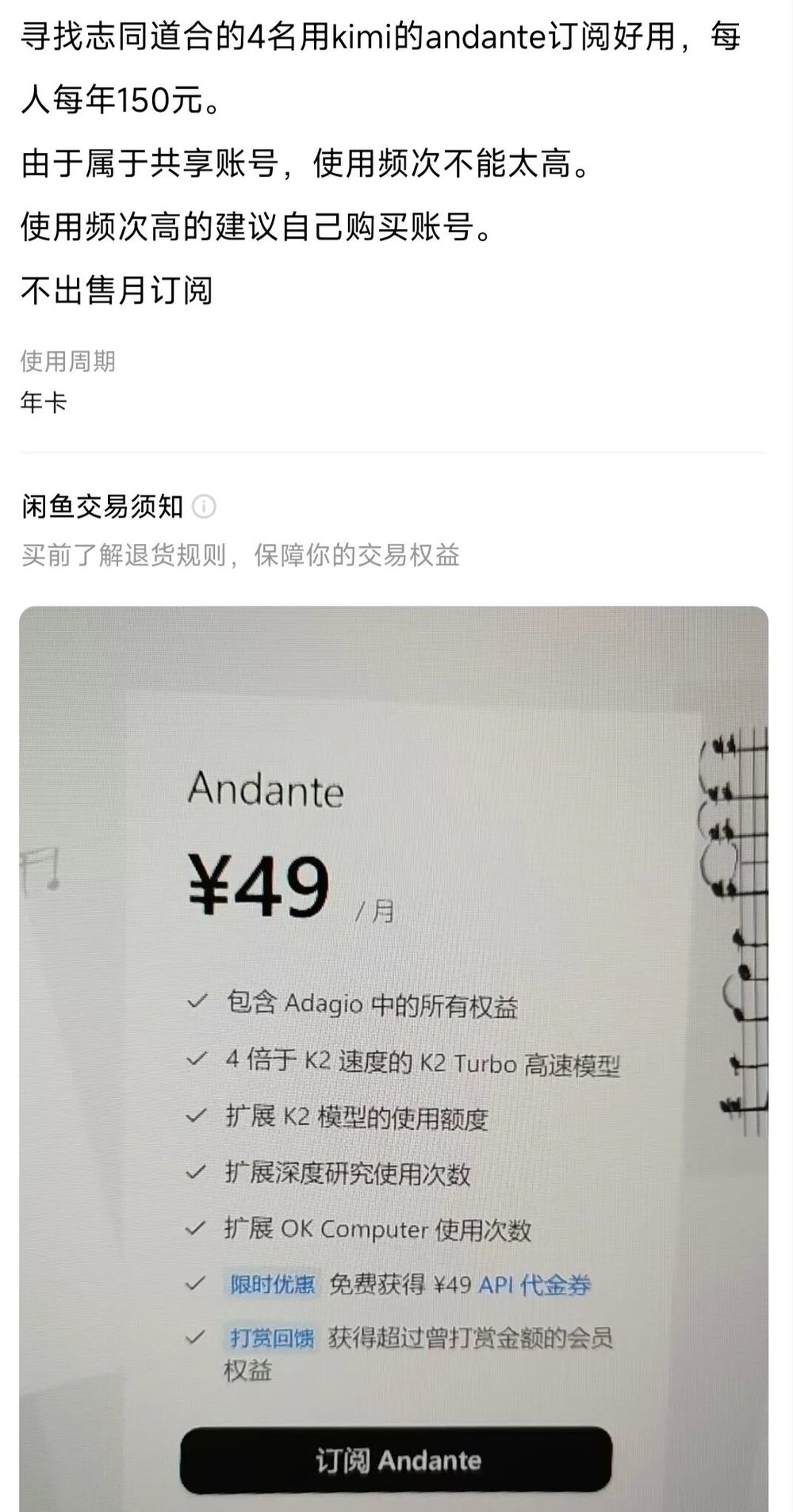 用户“莲藕”发布的一则商品链接引起了我的注意。他正找4名伙伴拼单Kimi标准版年订阅会员。