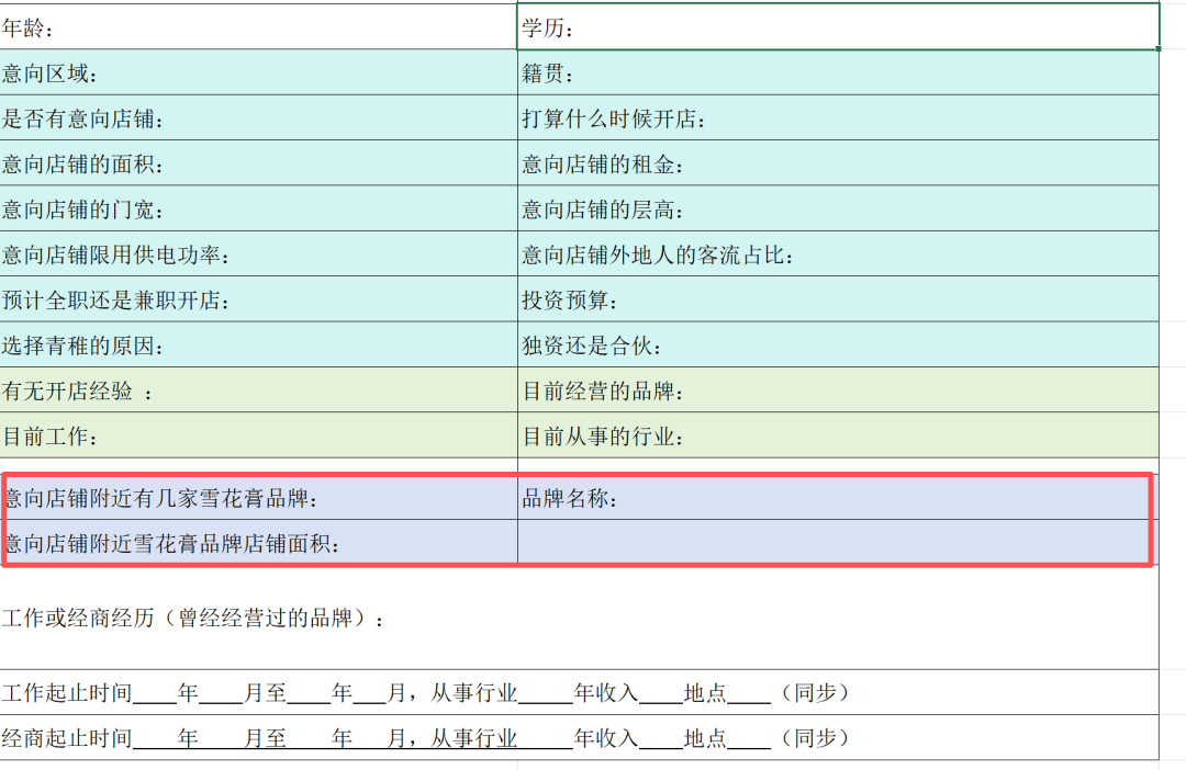 图 | 青稚的加盟登记表中,会特别关注店铺附近是否有其他雪花膏门店