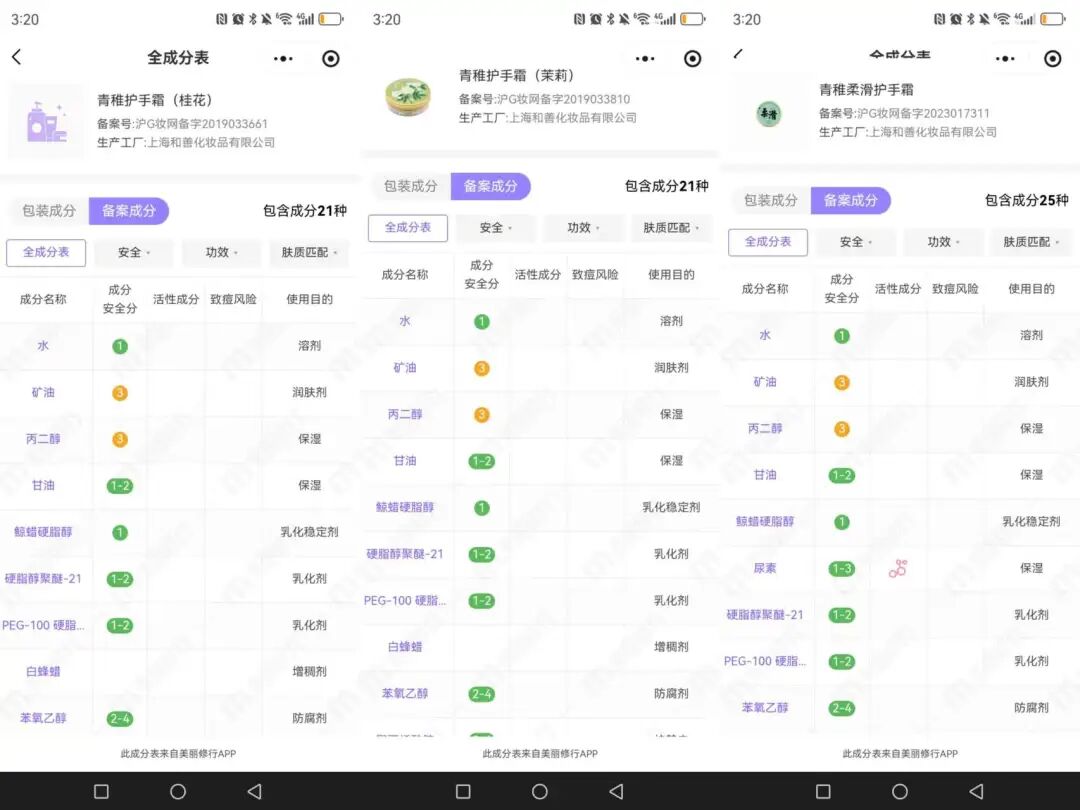图 | 青稚三款不同护手霜的配方,三者唯一差别在于香精、保湿剂添加上,其实可以视为同一产品
