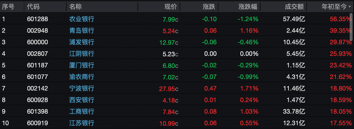 银行板块年初至今股价涨幅榜前十,图片来源Wind