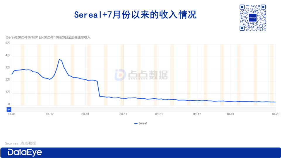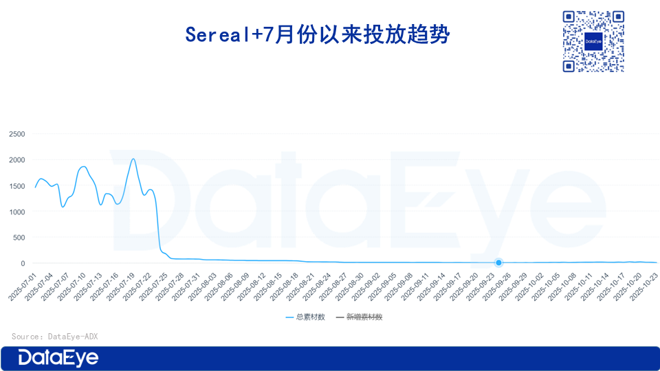 ADX海外短剧版数据显示,今年7月下旬之前,Sereal+日均投放素材量稳定在1500组左右,7月下旬起投放力度骤降,日素材量锐减至几十组;8月底至今,日投放素材量仅为个位数,可判断为基本停止投放。