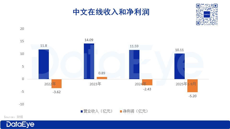 2025年前三季度,中文在线实现营收10.11亿元,同比增长25.12%;净亏损5.20亿元,亏损同比扩大176.64%。