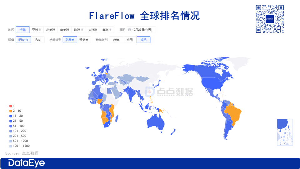 榜单表现方面,10月23日,FlareFlow跻身多国娱乐免费榜,其中巴西市场排名第8,美国、英国、加拿大分别位列第19名、第20名和第32名。