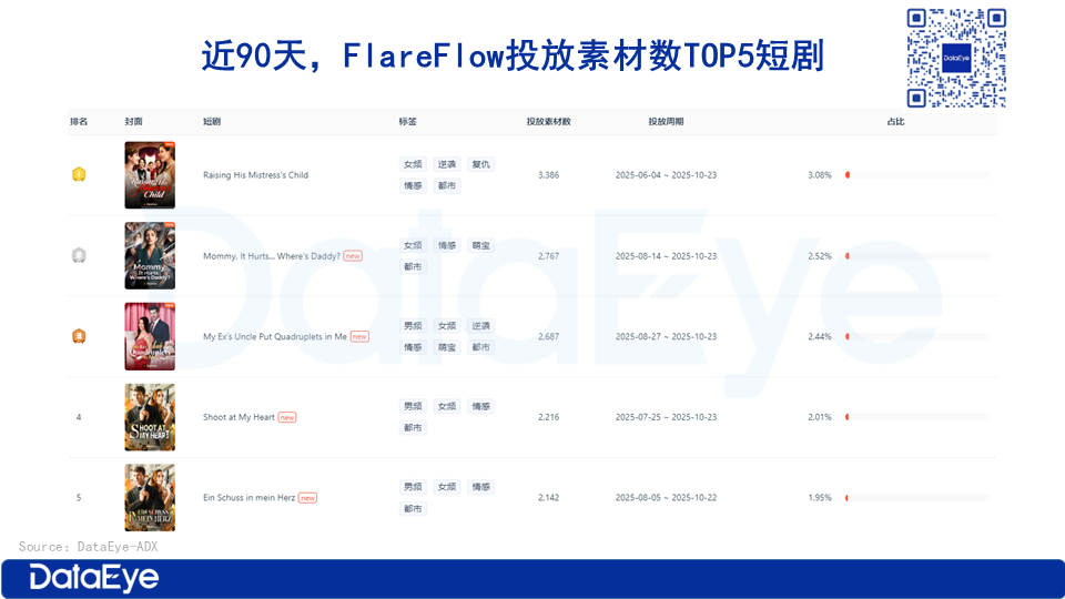 从投放素材量来看,近90天FlareFlow 投放短剧TOP3为《Raising His Mistress's Child》(女频复仇题材)、《Mommy, It Hurts... Where's Daddy?》(女频萌宝题材)和《My Ex’s Uncle Put Quadruplets in Me》(女频情感题材)。其中,《Raising His Mistress's Child》累计热值超1800万。