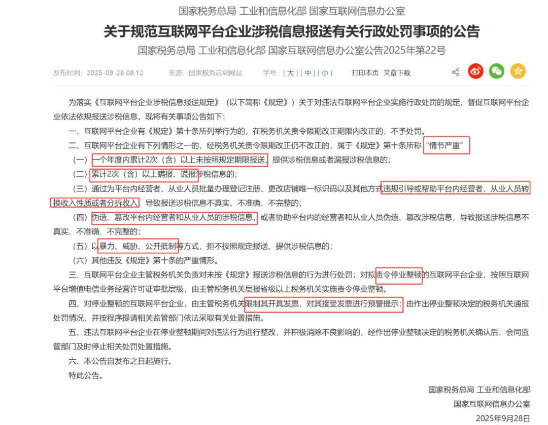 而在9月28日,国家税务总局再次发布《关于规范互联网平台企业涉税信息报送有关行政处罚事项的公告》围绕“适用情形、处罚主体、处罚措施”三方面,细化对违法互联网平台企业的处罚事项,进一步压实平台涉税责任。