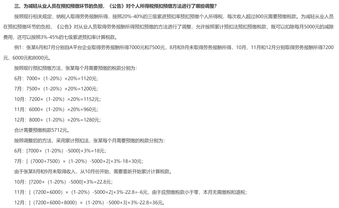 “新规”以后,允许按照累计预扣法预扣预缴税款,既可以扣除每月5000元的减除费用,还可以按照3%-45%的七级累进预扣率计算税款。