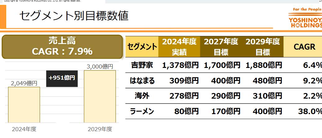 吉野家在中期经营计划中提到,计划将拉面业务销售额由2024财年的80亿日元,提升至2029财年的400亿日元;营业利润在这五年内提高10倍至40亿日元。到2029财年,拉面在吉野家的销售额占比将达13%,总店数达500家。