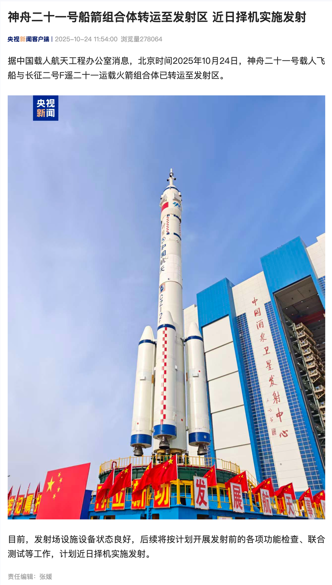 2025年10月24日,神舟二十一号载人飞船与长征二号F遥二十一运载火箭组合体已于当日转运至发射区。相关消息显示,目前发射场各项设施设备处于良好状态,后续将按既定流程开展发射前的功能检查和联合测试等准备工作,计划于近日择机执行发射任务。