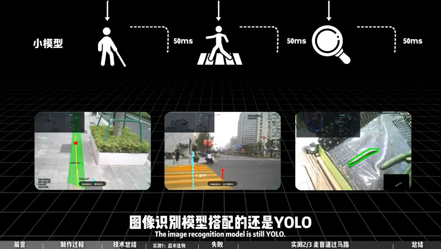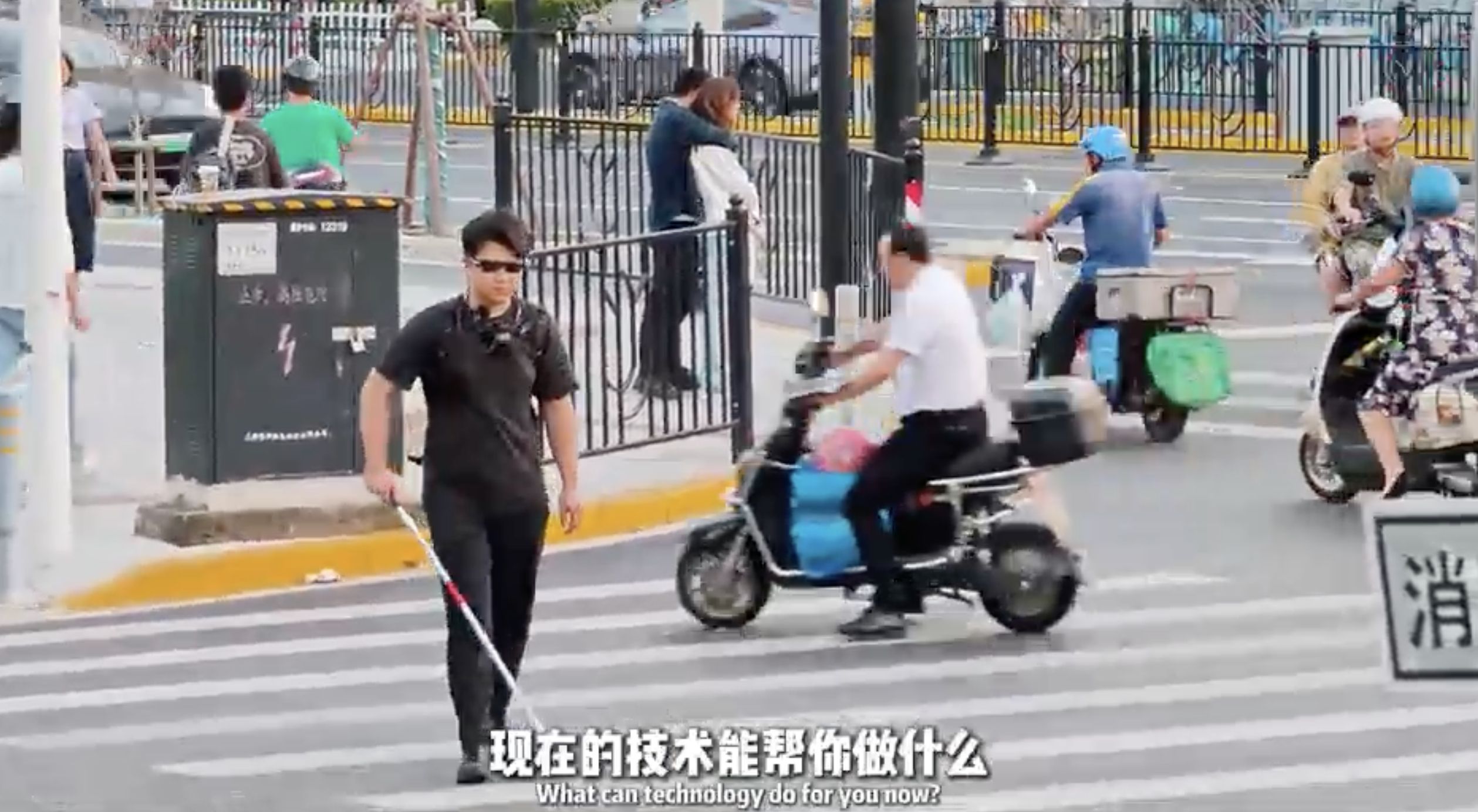 这个小哥戴上自家产品,模拟了盲人出行的一天,在盲道上走路,听AI提醒+纠错避开障碍物,过满是车流的红绿灯。到超市买水果,通过摄像头与耳机的指引拿到西瓜、黄瓜。让AI眼镜识别上海外滩的夜景,为他讲述眼前到底是怎样的造型与风韵,犹如聆听一首散文诗。