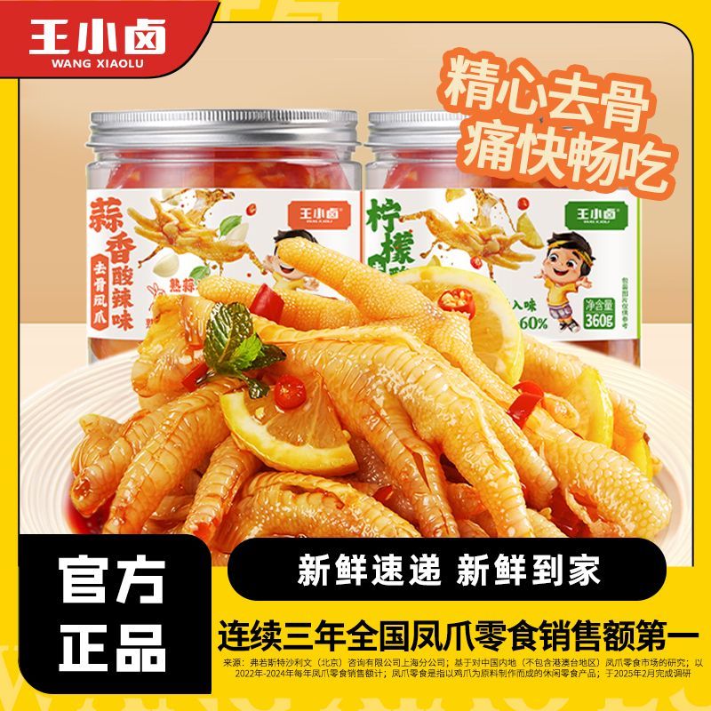 王小卤无骨鸡爪360g限时特惠来袭,柠檬酸辣蒜香味让你一口上瘾!精选优质凤爪经多重工艺脱骨处理,肉质Q弹入味,酸辣鲜香层次丰富,蒜香浓郁不腻口,是追剧、办公、聚会的绝佳休闲零食。