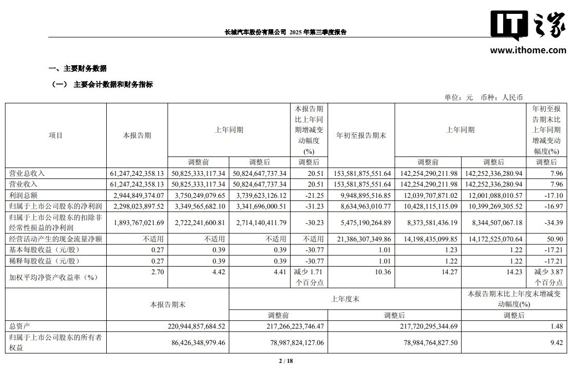 2025年10月24日,长城汽车公布2023年第三季度财报。报告期内,公司实现营业收入612.47亿元,较去年同期增长20.51%;归属于股东的净利润为22.98亿元,同比下降31.23%。