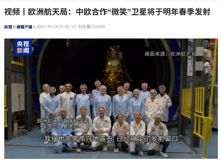 欧洲航天局于当地时间23日举行媒体见面会,介绍了与多国航天机构的合作情况,其中包括与中国在航天领域的合作进展。据透露,中欧携手研发的“微笑”卫星计划于2026年4月至5月间,在法属圭亚那库鲁航天中心发射升空,发射窗口初步定于4月8日至5月7日之间。该任务将由“织女星”运载火箭执行,目前相关团队正在现场开展各项发射准备工作。