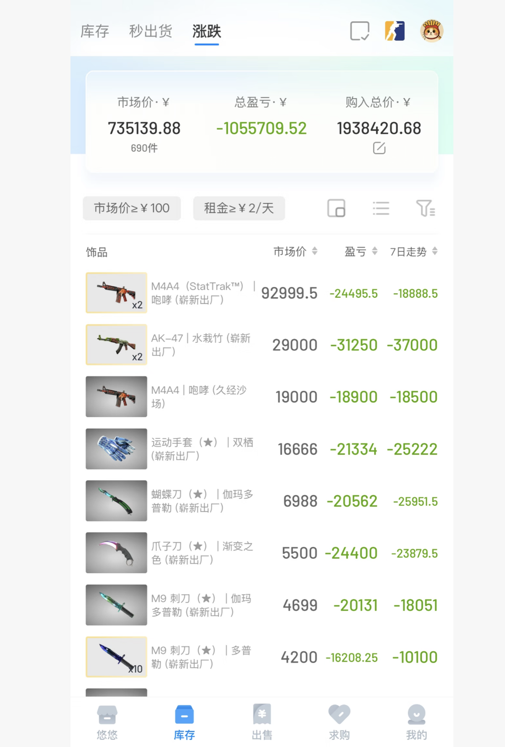 在这场闪崩中,最惨的当属 “倒狗”(即游戏饰品职业投机者)——社交媒体上,有玩家晒出截图,自己的账面浮亏已超 100 万元;还有部分玩家清空库存后发文表示,“今后不再参与任何饰品交易”。