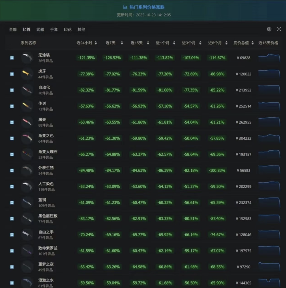 其次,《CS2》饰品的价值仅依赖于玩家的集体共识与新用户的持续流入,并无任何实体经济作为支撑。一旦共识破裂,比如平台调整规则、玩家大量流失,饰品价格便会出现无跌幅限制的狂跌(这与股市 10%-20% 的跌停限制截然不同),其风险远高于传统投资品。