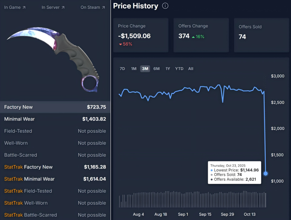 例如,市场上的高价饰品爪刀多普勒(Karambit Doppler),价格从 2700 多美元骤跌至 1100 多美元;“蝴蝶刀” 价格更是从 3 万元跌至 7800 元。