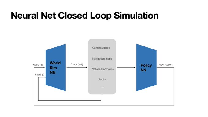 正因如此,在特斯拉,我们开发了一个神经世界模拟器(neural world simulator)。这个模拟器使用我们筛选出的同样的海量数据集进行训练。然而,它并非预测给定状态下的行动,而是根据当前状态和下一步行动来合成(synthesizes)未来状态。然后,这可以与智能体(agent)或策略AI模型连接起来,以闭环方式(closed-loop fashion)运行,从而评估性能。
