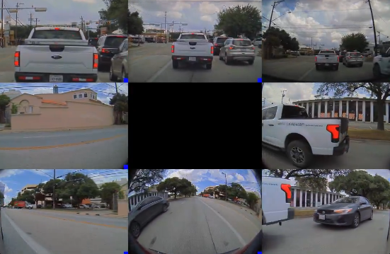 通过调整测试时计算资源(test-time compute)的用量,同一个模型可以实时模拟世界。下面是一个例子,一个人能够驾驶超过6分钟,期间所有8个摄像头的画面(每秒24帧)完全由一个神经网络实时合成。你可以注意到,即使在如此长的生成时间内,细节也相当逼真。