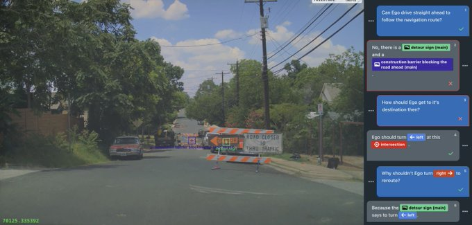 除了3D几何结构,系统还可以结合视频溯源(video grounding),用自然语言进行推理。一个小型版本的推理模型已经在FSD v14.x版本中运行。