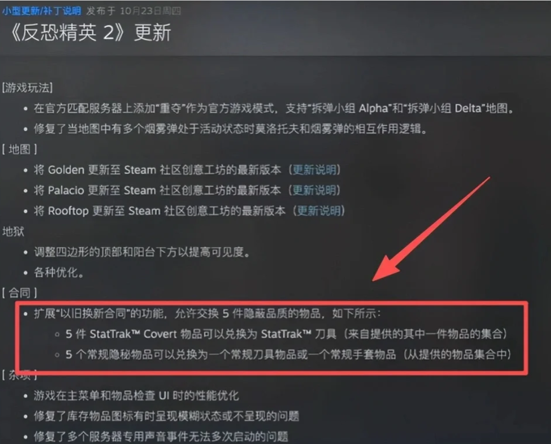 V社公布了CS:GO的游戏更新,导致高端饰品稀缺性不再:5件普通红枪皮可合成 1 把普通刀具或 1 副普通手套;5件StatTrak™(玩家俗称 “暗金”,带击杀计数器)红枪皮可合成 1 把 StatTrak™刀具。