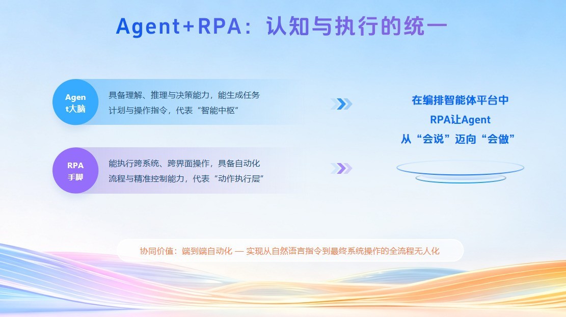 🖥️ RPA融合升级:通过Agent+RPA方案,实现自然语言指令到实际业务操作的全自动处理,如财务报销的自动数据导出、发票整理与提交。