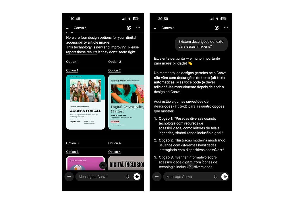Por exemplo, o Canva consegue gerar imagens diretamente da interface de chat do ChatGPT. Ele gera várias opções e pede para que o usuário escolha uma. No entanto, o agente não gera as descrições de imagem automaticamente.