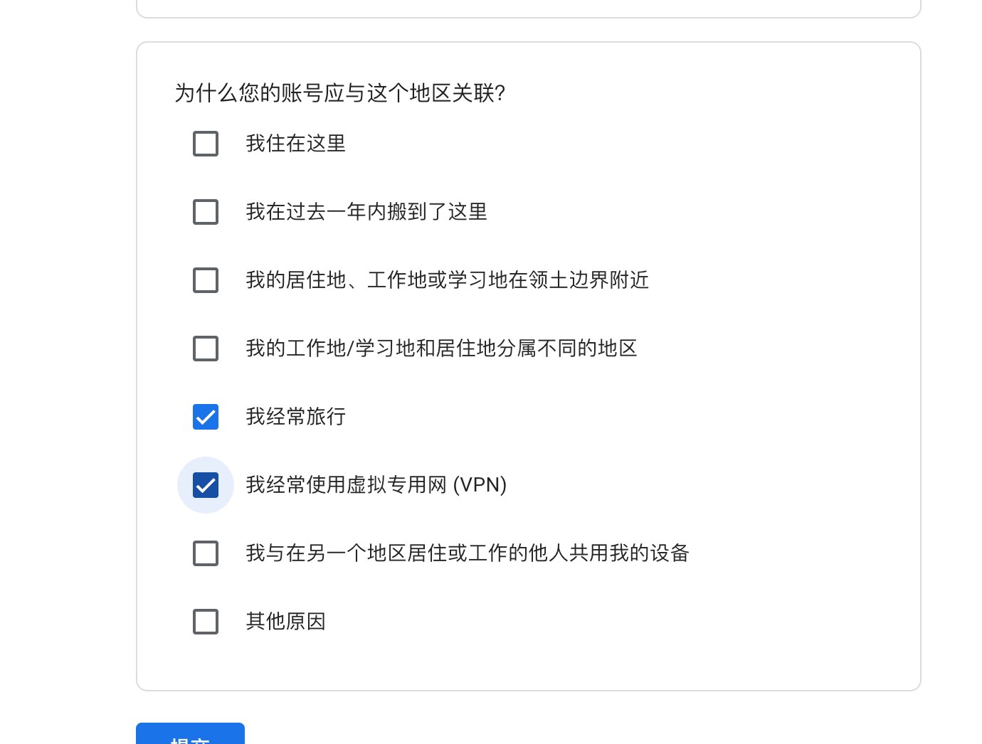 而这个区域是不能自己设置的,是 Google 根据你过去一年的行为自动识别的,我之前一直被识别为“新加坡”。